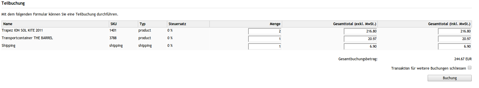 Sie können nun jeden Artikel einzeln verbuchen, sofern Sie nicht alle Artikel auf einmal versenden können. Die Anzahl der Verbuchung von Teilbeträgen hängt von Ihrem Vertrag ab. Erkundingen Sie sich diesbezüglich direkt bei Authipay.