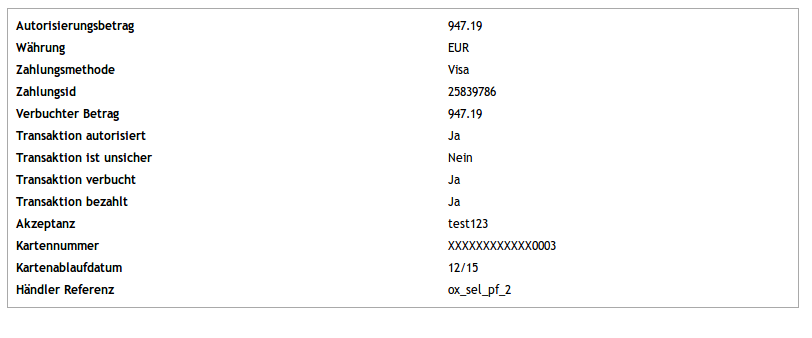 Nachfolgend finden Sie die Testdaten für die Zahlungsmethoden:Kartennummer 5404 1070 0002 0010 Expiry Date 12/2020 CVC 123 |