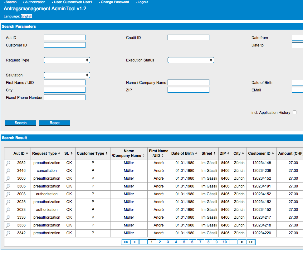 Das Alter des Kunden muss mehr als 20 Jahre betragen. Der Nachname des Kunden wird verwendet um das Resultat zu steuern. Dieser stellt sich aus dem ursprünglichen Namen und zwei Modifikatoren zusammen: