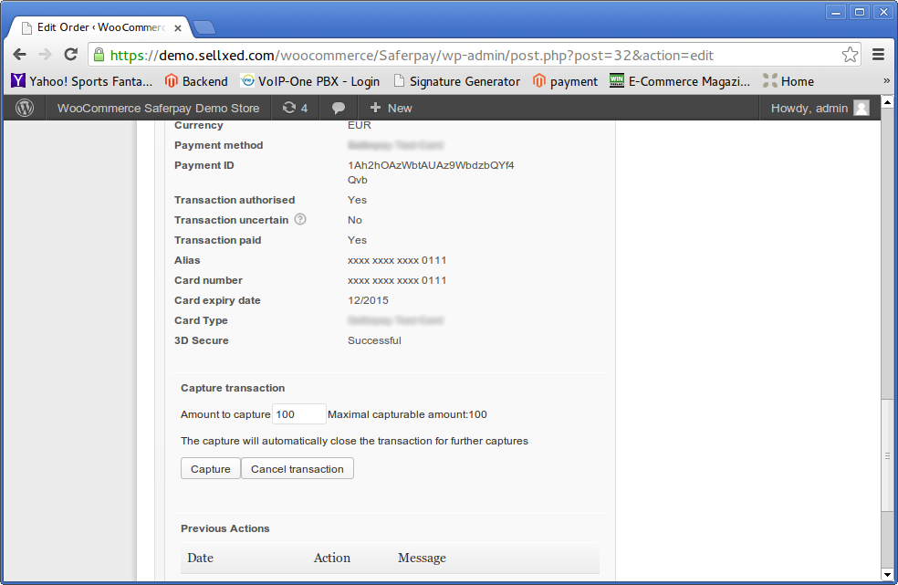 Um Bestellungen zu verbuchen, öffnen Sie die Bestellung (Dashboard > Store Sales) und anschliessend die Transaktionsinformationen. Im Eingabefeld tragen Sie den Betrag ein, welchen Sie erfassen möchten. Mit einem Klick auf Capture wird die Karte direkt belastet.