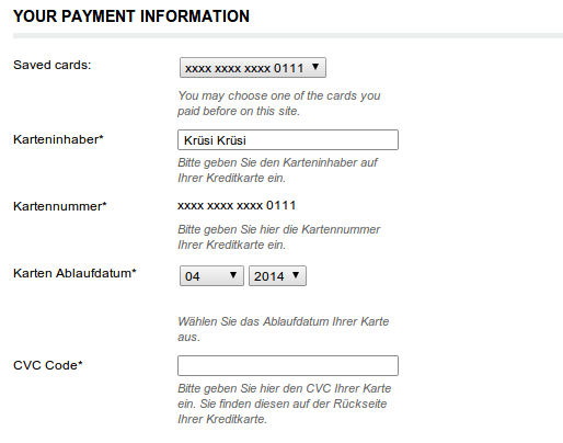 Kartennummer 4000012892688323 Expiry Date 12/2020 CVC 123 | Visa |