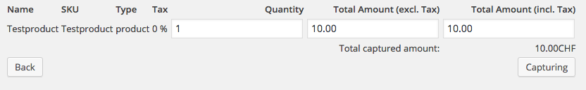 Tragen Sie die Beträge für die entsprechenden Produkte ein, die Sie dem Kunden belasten möchten. Mit dem Klick auf Capturing erfolgt eine direkte Verbuchung der Bestellung bei NatWest Tyl.