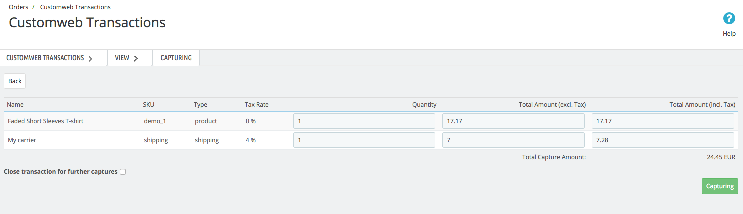 Tragen Sie die Beträge oder Quantitäten ein, welche Sie dem Kunden belasten möchten. Mit dem Klick auf Capturing erfolgt eine direkte Verbuchung der Bestellung bei TWINT.