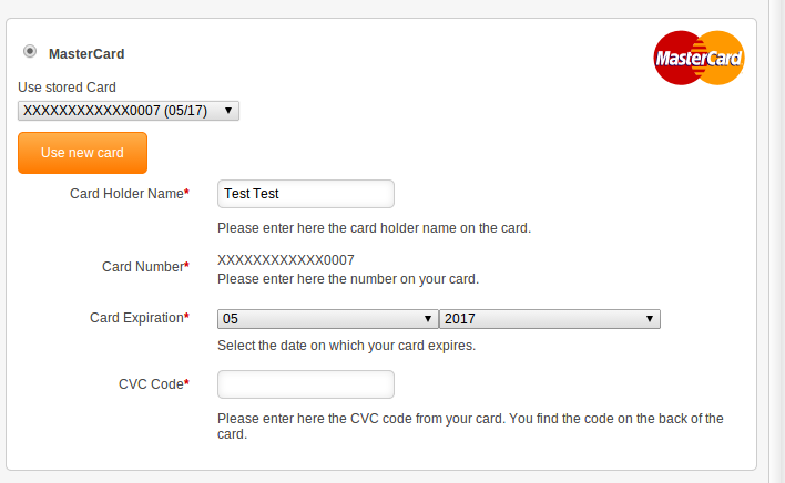 In the following section you can find the test data for the various payment methods:Card number 5555555555554444 Expiry Date 12/2023 CVC 123 | Mastercard |