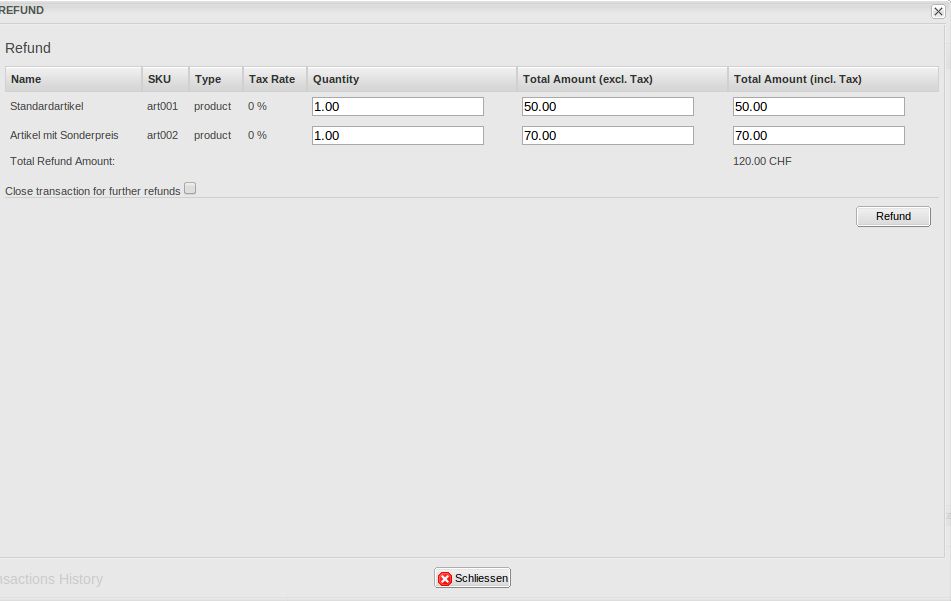 In order to issue a refund, open the transaction information (c.f. above). This shows all information on the transaction. With a click on "Refund", an input mask for credit notes will open. By clicking Refund , the refund request is transmitted to EVO E-PAY.