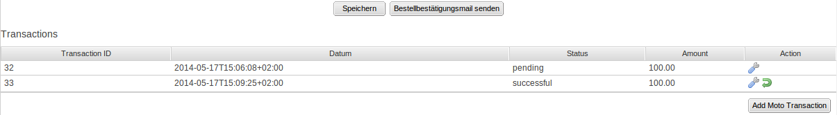 To view this information, open the orders. At the bottom of the order you will find the paragraph EVO E-PAY Transactions. This shows all details on all former actions related to this order. Click on the key in the column "Action" to see the transaction information (c.f. image "Transaction Information").