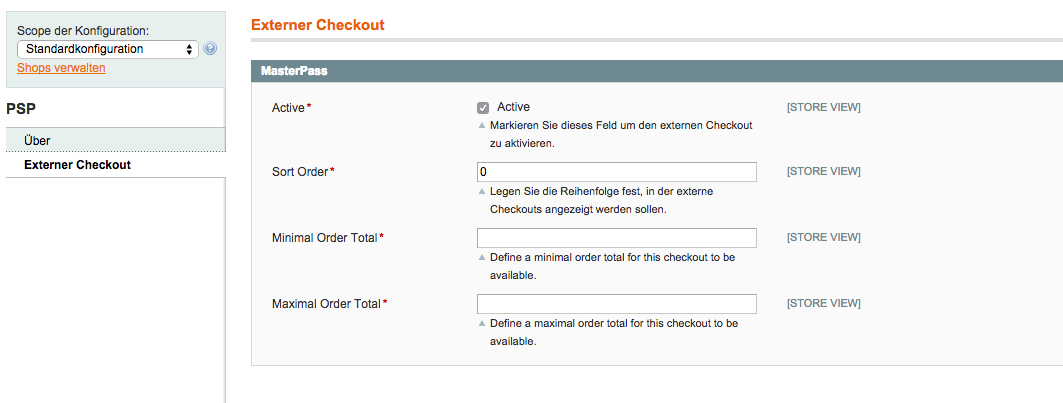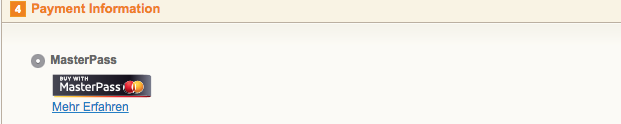 When using MasterPass as a payment method for standard checkout, it is mandatory to link to the MasterPass Learn More Page. In order to do this, navigate to Payment Method Configuration. Paste the link for the Learn More Page into the field 'Description' for the respective languages. The field 'Learn More' will now be displayed when choosing a payment method.