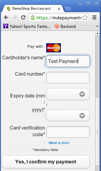Card number 4000 0000 0000 0002 Expiry Date 12/2020 CVC 123 | VISA (With 3-D Secure Check) |