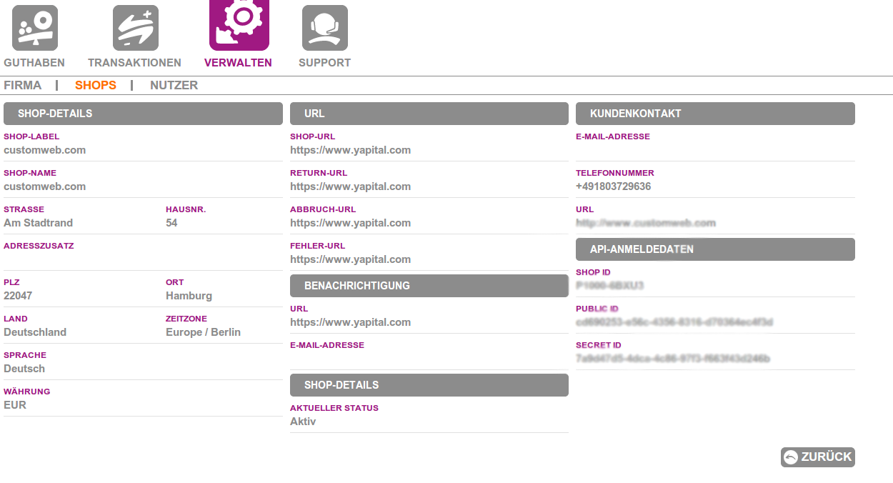 Diese Informationen erhalten Sie entweder direkt von Yapital. Alternativ finden Sie diese auch in Ihrem Yapital Business Account unter Verwalten > Shops.