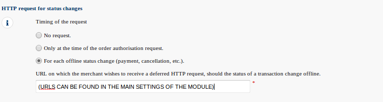 Pour utiliser cette fonctionnalité, vous devrez sélectionner l'option Lors de tous les changements de statut offline (paiement, annulation...). Ensuite il suffit de copier l'URL affichée dans l'onglet setup de la configuration du module (notification des transactions). Insérez l'URL indiquée dans le champ "URL sur lequel le marchand souhaite recevoir une requête HTTP différée en cas de changement de statut de transaction offline (hors ligne)."